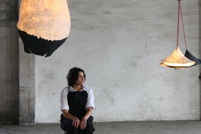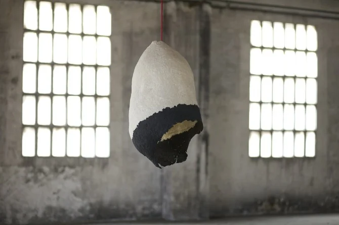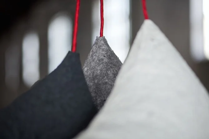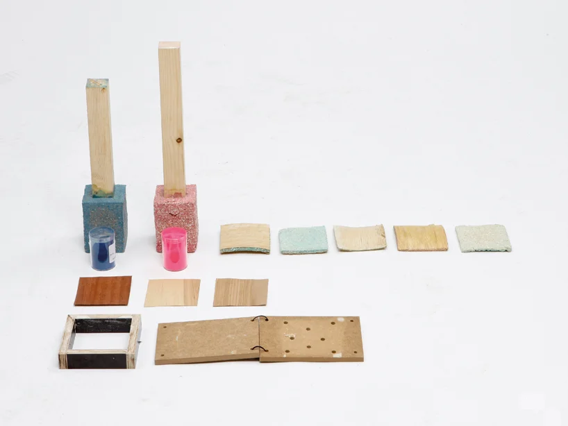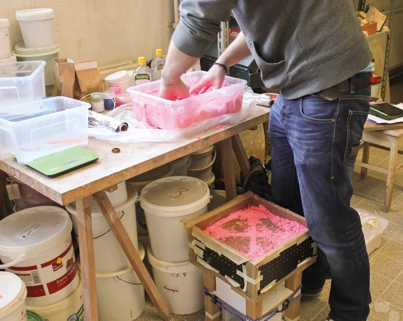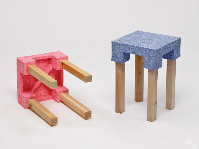 He binds the eggshell 'pulp' with casein, vinegar and starch. He colours, then cooks the seat in an oven at high temperature. The other components being the legs are made from wood making the structure completely decomposable.